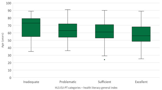 Age distribution through the several categories of health literacy appears to follow a descendent trend when associated with higher levels of health literacy, evidencing lower median values but higher interquartile ranges (Figure 4).