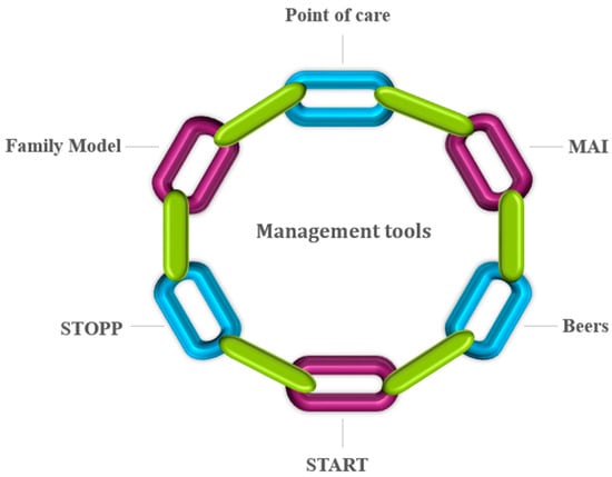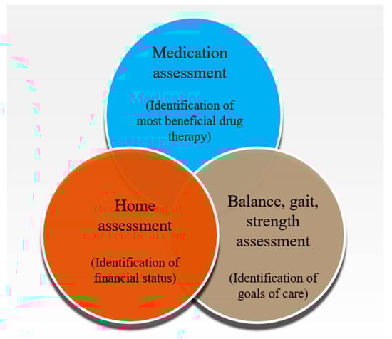 Appropriate polypharmacy deals with the prescription of multiple medications in an optimized way to an individual suffering from complex conditions or for multiple conditions according to best evidence. The management plan for polypharmacy involves medication assessment and home assessment. It also incorporates balance, gait, and strength assessment (Figure 3). These are achieved partly or as a whole by eliminating duplicate medications, conducting medication reconciliations at care transition, assessing drug–drug interactions, and by reviewing drug dosages to reduce the incidence of polypharmacy [70,71,72,73,74]. It also ensures patient safety and reduces hospitalization, thereby decreasing the associated costs. It has been well documented that various tools and treatment approaches are used in parallel as there exist no ideal tools to manage polypharmacy in the elderly population [75]. It depends on the application of medications and time suitability which enables the users to employ one of existing interventions and/or tools to obtain the optimized results. Several researchers concluded that the utilization of a drug based upon the explicit assessment tools offered the best practical approach [76,77,78,79,80,81].