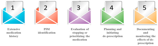 Deprescribing is a patient-centered process of medication withdrawal intended to achieve improved health outcomes through discontinuation of one or more medications that are either potentially harmful or no longer required [33]. It is a five-step, patient-centered systematic approach (Figure 2) used for evaluating and discontinuing medications in patients where potential harms exceed potential benefits in relation to individual existing functioning capability, care goals, preferences, values and life expectancy. Hence, this process suspends medication, changes medication, and decreases medication dosages for obtaining the best clinical outcomes [34]. This is because deprescribing approaches are patient-specific and focused and follow interventions with appreciable variability in medications used and patient characteristics [35]. The process of deprescription should be initiated as a “therapeutic intervention” simultaneously by introducing clinically appropriate therapy. Hence, it becomes imperative for a physician to examine patient approach on goals of therapy. It also takes into consideration the basic parameters of chronic conditions and medications and affords prime concern regarding prescription to slow down the disease progression along with minimizing the health decline [36,37]. It has been observed that only a limited percentage of the elderly community debate health-related decision-making priorities with their primary care physicians. Hence, in order to optimize disease control, the physician should examine specific therapeutic goals at every patient visit. Additionally, health systems and practices need to adopt rationalized and updated methods for tracking and medication reconciliation as up-to-date medication lists form the basis of identifying potential medications for deprescribing, which could minimize the burden of staff, patient, and physician [38,39,40]. Sawan et al. (2020) have recently summarized the common deprescribing interventions, including enablers and barriers to implement deprescribing across settings (e.g., primary, secondary, residential care facilities) and current deprescribing polices in place internationally [41]. Several deprescribing tools have been used recently, e.g., mobilizing community pharmacists [42], creating evidence-based deprescribing guidelines [43], geriatric pharmacoeconomics [44], and engaging primary care providers in deprescribing trials [45,46]. The dedicated team involved in the management of health-related issues with the elderly patients shall be advised to follow the process of deprescribing medication qualitatively (focused groups) and quantitatively by Delphi’s criteria [12]. Further, Bruyere deprescribing guidelines could prove beneficial in case of managing the deprescription in relation to the elderly patients in case of antihypertensive medications, psychotic medications, proton pump inhibitors, antihistamines, anti-hyperglycemic agents, sedatives and hypnotics, anticholinergics, and cholinesterase inhibitors; and OncPal deprescribing guidelines in the case of oncological and palliative care medications [47].