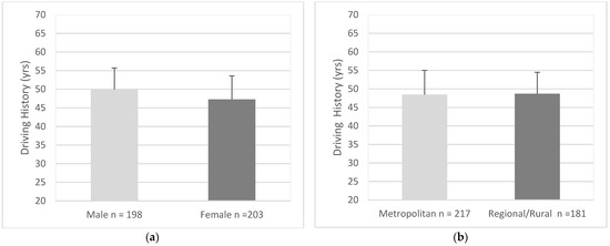 Driving history was comparable between residential areas, principal and non- principal drivers and drivers with low and mixed readiness for mobility change. However, there was a noticeable difference in driving history between genders, with males having more driving experience than females. Additionally, males self-reported most of the driving in households where other drivers were present and drove on a daily basis, more often than females. Males were also more likely to suggest their driving was better than other people of the same age and gender than females. Taken together, these findings seem to align with the pervasive cultural imagery of masculinity, driving and the need to be successful and in control [18].