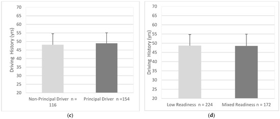 Differences in driving history between groups; (a) Gender, (b) Residential Area, (c) Driving Roles, (d) Readiness. Error bars represent standard deviation.