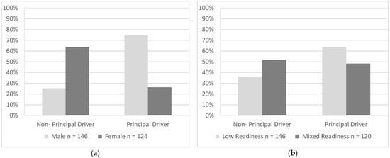 For this sample of drivers, a significantly higher proportion of males (75%) reported to be principal drivers in the household compared with females (36%), χ2(1, N = 270) = 40.28, p < 0.001 (Figure 2a). A significantly higher proportion of drivers with low readiness were principal drivers (64%) when compared with drivers with mixed readiness (48%), χ2(1, N = 266) = 6.34, p = 0.012 (Figure 2b).