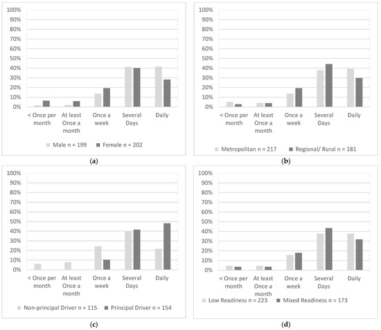 A significantly higher proportion of males (42%) drove daily when compared with females (28%), χ2(1, N = 401) = 17.25, p = 0.002 (Figure 3a). There was a similar proportion of drivers from metropolitan areas (39%) and remote areas (30%) who drove daily, χ2(1, N = 398) = 6.62, p = 0.157 (Figure 3b). A significantly higher proportion of principal drivers (48%) drove daily compared to non-principal drivers (20%), χ2(4, N = 269) = 41.69, p < 0.001. (Figure 3c) There was a similar proportion of daily drivers with low readiness (38%) and mixed readiness (32%), χ2(1, N = 396) = 2.53, p = 0.639 (Figure 3d).