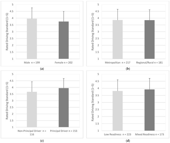 Males (M = 3.96, SD = 0.80) were significantly more likely to say they were ‘better’ drivers when compared to individuals of the same age and gender than females (M = 3.75, SD = 0.75), (95% CI, 0.07 to 0.37), t (399) = 2.81, p = 0.005 (Figure 4a). Drivers in metropolitan areas (M = 3.86, SD = 0.79) and drivers in regional/rural areas (M = 3.85, SD = 0.77) were similar in how they perceived their driving standard (95% CI, −0.15 to 0.16), t (396) = 0.08, p = 0.936 (Figure 4b). Principal drivers (M = 3.95, SD = 0.72), were significantly more likely to say they were better drivers than non-principal drivers (M = 3.67, SD = 0.77), (95% CI, −0.46 to −0.10), t (267) = 3.01, p = 003 (Figure 4c). Drivers with low readiness (M = 3.81, SD = 0.79) and mixed readiness were similar in how they perceived their driving standard (M = 3.92, SD = 0.78), (95% CI, −0.27 to 0.04), t (394) = 1.41, p = 0.159 (Figure 4d).