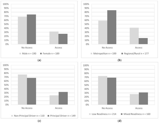 The availability of alternative transport was similar for males (32%) and females (26%), χ2(1, N = 379) = 1.48, p = 0.224 (Figure 5a). Drivers in metropolitan areas (42%) had significantly greater availability of alternative transport than drivers in regional/regional communities (15%), χ2(1, N = 376) = 30.65, p < 0.001 (Figure 5b). Availability of alternative transport was similar for principal drivers (32%) and non-principal drivers (24%), χ2(1, N = 259) = 2.28, p = 0.131 (Figure 5c), and for drivers with low readiness scores (27%) and mixed readiness scores (31%), χ2(1, N = 374) = 0.77, p = 0.381 (Figure 5d).