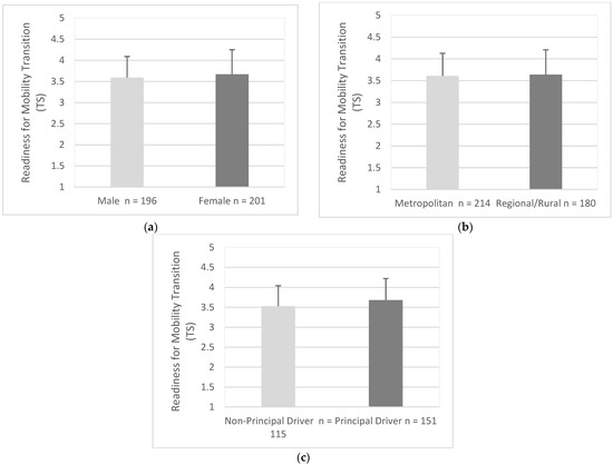 Males (M = 3.59, SD = 0.50) had a similar level of readiness for mobility transition to females (M = 3.67, SD = 0.58), (95% CI, −0.19 to 0.02), t (395) = 1.52, p = 0.128 (Figure 6a). Drivers from metropolitan areas (M = 3.61, SD = 0.52) had a similar level of readiness to drivers in regional/rural areas (M = 3.64, SD = 0.57), (95% CI, −0.14 to 0.08), t (392) = 0.54, p = 0.587 (Figure 6b). Principal drivers (M = 3.68, SD = 0.54) had a lower level of readiness when compared to non-principal drivers (M = 3.53, SD = 051.), (95% CI, −0.28 to −0.02), t (264) = 2.33, p = 0.021 (Figure 6c).