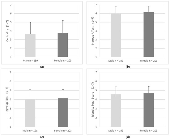 Mean score for identity factors and total scores as endorsed by male and female participants. Items were measured using responses of 1 (strongly disagree) to 7 (strongly agree). Error bars represent standard deviation. (a) Centrality, (b) Ingroup Affect, (c) Ingroup Ties, (d) Identity Total Score.