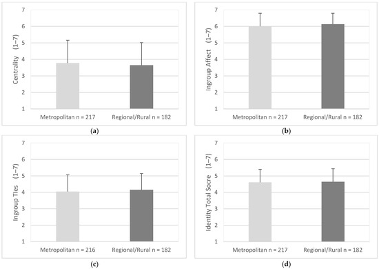 Scores of centrality were similar for drivers in metropolitan areas (M = 3.65, SD = 1.34) and drivers in regional/rural areas (M = 3.78, SD = 1.38), (95% CI, −0.15 to 0.40), t (397) = 0.90, p = 0.372 (Figure 8a). Ingroup affect scores were similar for drivers in metropolitan areas (M = 6.01, SD = 0.79) and drivers in regional/rural areas (M = 6.14, SD = 0.66), (95% CI, −0.28 to 0.01), t (397) = 1.80, p = 0.072 (Figure 8b). Ingroup ties scores were similar for drivers in metropolitan areas (M = 4.05, SD = 1.02) and drivers in regional/rural areas (M = 4.16, SD = 0.99), (95% CI, −0.31 to 0.09), t (396) = 1.06, p = 0.292 (Figure 8c). Total scores for Identity were similar for drivers in metropolitan areas (M = 4.61, SD = 0.79) and drivers in regional/rural areas (M = 4.61, SD = 0.79), (95% CI, −0.20 to 0.12), t (397) = 0.50, p = 0.619 (Figure 8d).
