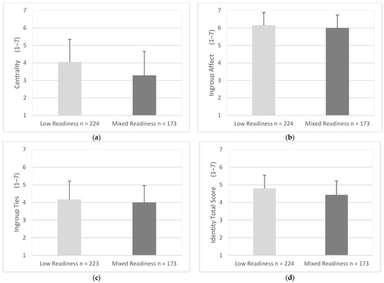 Mean score for identity factors and total scores as endorsed by participants for low readiness and mixed readiness for mobility change. Items were measured using responses of 1 (strongly disagree) to 7 (strongly agree). Error bars represent standard deviation. (a) Centrality, (b) Ingroup Affect, (c) Ingroup Ties, (d) Identity Total Score.
