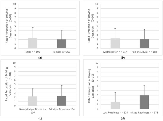 Perception of driving cessation as endorsed by participants in each group. Participants rated driving cessation with responses of 0 (extremely negative) to 10 (extremely positive). (a) Gender, (b) Residential Area, (c) Driving Roles, (d) Readiness.