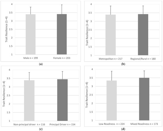 Trait resilience was similar for males (M = 3.40, SD = 0.43) and females (M = 3.41, SD = 0.56), (95% CI, −1.17 to 0.08), t (398) = 0.37, p = 0.714 (Figure 12a). Trait Resilience was similar for drivers in metropolitan areas (M = 3.39, SD = 0.51) and drivers in regional/rural areas (M = 3.42, SD = 0.49), (95% CI, −0.13 to 0.07), t (395) = 0.55, p = 0.585 (Figure 12b). Trait resilience was similar for principal drivers (M = 3.45, SD = 0.46) and non-principal drivers (M = 3.39, SD = 0.46), (95% CI, −0.62 to 0.45), t (268) = 0.32, p = 0.275 (Figure 12c). Trait resilience was significantly lower for drivers with low readiness scores (M = 3.34, SD = 0.55) when compared with drivers with mixed readiness scores (M = 3.50, SD = 0.41), (95% CI, −0.26 to −0.06), t (393) = 3.25, p = < 0.001 (Figure 12d).