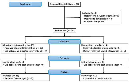 CONSORT flowchart in this study. Twenty-nine participants were randomly assigned to an intervention (n = 15) or control group (n = 14).
