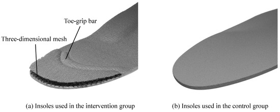 The insoles used in the intervention and control groups. (a) The intervention group used insoles consisting of a toe-grip bar and three-dimensional mesh. (b) The control group used regular insoles without a toe-grip bar.