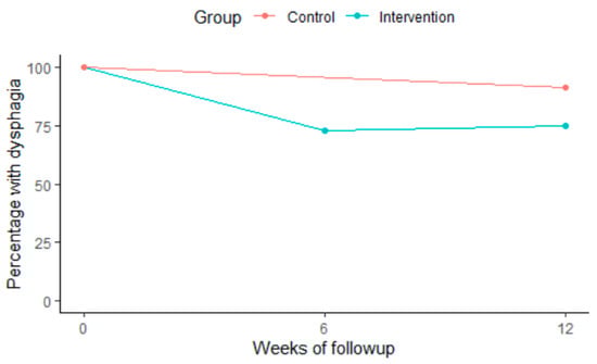 This positive trend in the intervention group was also seen when presenting the proportion of participants with OD in both groups among complete cases (Figure 3). All had OD at baseline, while 62.3% (n = 31) in the intervention group and 76.7% (n = 33) in the control group had dysphagia at follow-up after 12 weeks (p = 0.24 among complete cases). The absolute values of outcomes can be found in Table 2.