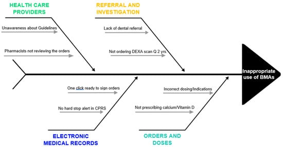 Another challenge while prescribing BMAs is the potential side effect of osteonecrosis of the jaw (ONJ) []. The incidence of ONJ is approximately 1% to 9% of patients with advanced malignancies []. While most of the existing literature has focused on the continuing concerns of the appropriate use of BMAs, there is incomplete understanding or underdeveloped research on ONJ. Alleviating the risk for ONJ through screening dental care reduces the BMA treatment interruptions and improves the quality of life while using these therapies []. The Multinational Association of Supportive Care in Cancer/International Society of Oral Oncology (MASCC/ISOO) and ASCO have established clinical practice guideline for the prevention and management of medication-related ONJ []. Dental screening is a strong recommendation for oncologists to request before prescribing BMAs. However, there is a significant proportion of oncologists who still do not refer patients for a dental screening [,]. Hence, there are multiple factors at various steps that can lead to inappropriate use of BMAs (Figure 1).