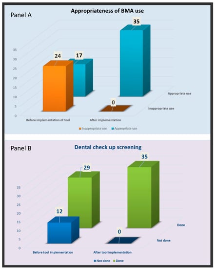 Comparing the change in the practice while prescribing BMA (panel A), and referral for dental screening (panel B) with the implementation of new algorithmic tool into Computerized Patient Record System.