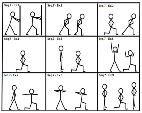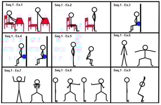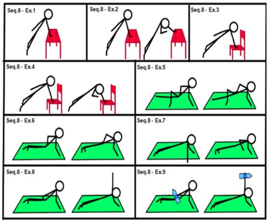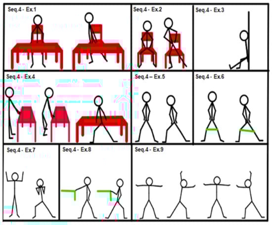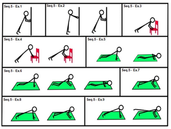 Past and recent studies have also confirmed the effectiveness of exercise training interventions on physical function in elderly people [19,20,25]. In home-based exercise in general [1], and even more so when choosing a home-based group exercise program for elderly people [39], the prescription of the program has to be even more detailed. The choice of exercises and progression criteria are very important for both the research [1] and adherence to the program [12,21], as well as for its safety and efficacy [6,28]. A home setting requires only minimal equipment. We therefore chose 72 exercises mainly involving the patient’s body weight and, in some cases, elastic bands. The exercises in a sequence ranged from the easiest at level 1 to the most complex at level 9: in case of improvement, according to the progression criteria already described, the patient moved on to the next exercise within the same sequence and not skipping any exercise. Therefore, always starting from the first exercise of the sequence, the therapist chooses, among the exercises, the one that best fits the patient’s condition. In choosing the subject’s ability level within the range of possibilities allowed by the sequence, a form of evaluation of the subject must be carried out, but further validation studies are necessary in this respect. The use of exercise sequences allows the subject to have constant feedback on his/her condition of physical ability. Work progression is characterized not only by the increase in training volume but also by the transition to a higher exercise level—that is, a different and more complex exercise requiring superior motor skills. In this way, the therapist can obtain better subject compliance in supported and unsupported sessions. However, training progression can take place only in supported sessions.