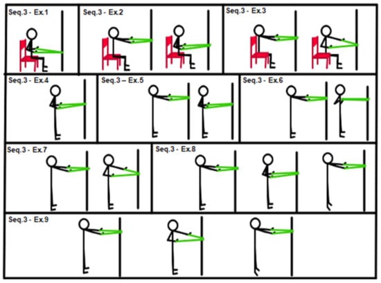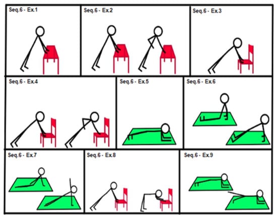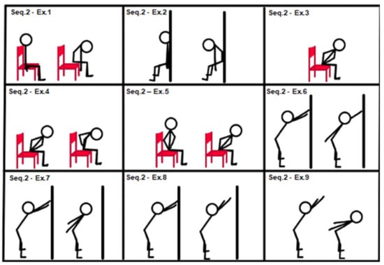 Figure 2, Sequence 2: (1) chair “spinal wave”; (2) wall “spinal wave”, lower back against the wall; (3) isometric back extension (sitting on a chair, trunk–hip angle at 45°, hands on hips); (4) from previous position 3 to “spinal wave”; (5) back extension (sitting on a chair, hands on hips, from trunk–hip angle at 45° to 90°); (6) alternating shoulder back elevation (stand up position, hip–trunk angle at 45°); (7) double back shoulder extension (stand up position, hip–trunk angle at 45°); (8) shoulder back elevation (stand up position, hip–trunk angle at 45°); (9) dynamic movement from exercise position 7 to 8 and return.