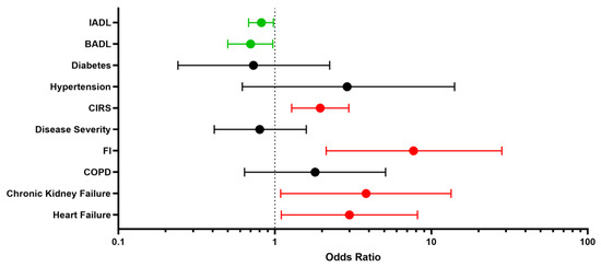 Determinants of re-hospitalization: risk factors (red) and protective factors (green). Forest plot. BADL indicates Basic Activities of Daily Living; IADL, Instrumental Activities of Daily Living; CIRS, Cumulative Illness Rating Scale; FI, Frailty Index; COPD, Chronic Obstructive Pulmonary Disease.