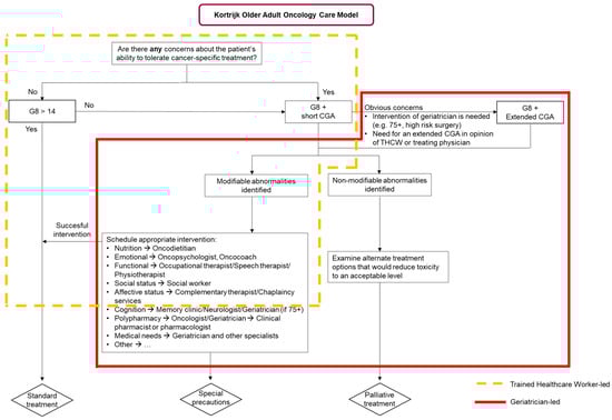 With the support of the National Cancer Plan in Belgium, the “oncogeriatric clinic” was founded at the OECI-designated Kortrijk Cancer Centre in 2010. This clinic is staffed by both scientific research associates responsible for the research aspect and oncopsychologists responsible for daily practice, hereafter referred to as trained healthcare workers (THCWs). Throughout the years, we have optimized the workflow of the oncogeriatric team at the Kortrijk Cancer Centre, which resulted in the “Kortrijk older adult oncology care model” (Figure 1). The initial step in routine practice is the administration of the Geriatric 8 (G-8) questionnaire. The G-8 screening tool identifies those older adults with cancer who would benefit from a CGA [10,11], and indicates quality-adjusted survival [12]. This two-step approach is performed by the team of oncopsychologists of the oncogeriatric clinic who are trained to administer the geriatric assessments (THCW-led pathway). If there are no concerns about the patient’s ability to tolerate cancer-specific treatment, the patient will be screened with the G-8 screening tool and sequentially receive standard cancer treatment when G-8 negative. However, if there are concerns and the patient effectively scores 14 or less on the G-8, the patient undergoes a short CGA (sCGA) performed by the THCW (Table 1). In the case of obvious concerns, such as a high-risk surgery, older adults with cancer can be referred to the geriatrician-led pathway (Figure 1). The geriatrician-led pathway involves an in-depth evaluation of multiple domains of the CGA, including extended CGA (eCGA), at the geriatric day clinic by a multidisciplinary team, which is supervised by the geriatrician. This is often combined with scheduled pre-operative or staging examinations at the geriatric day clinic to mitigate time toxicity for the patients.