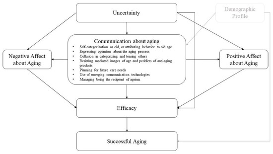 The Communication Ecology Model of Successful Aging (CEMSA) was established to expand the role that communication plays in the aging process [37]. CEMSA was developed based on the idea that a person’s assessment of uncertainty about age and aging is shown by the way a person communicates. Communication as a part of interaction [38] predicts successful aging [39]. When people communicate about their age and aging in higher uncertainty it leads to more negative effect [36]. In reverse, people’s communications about their age and aging in lower uncertainty led to a more positive effect [36]. A related study indicated that more uncertainty and negative mood were related to diminished efficacy, whereas greater positivity was related to increased efficacy [36].
