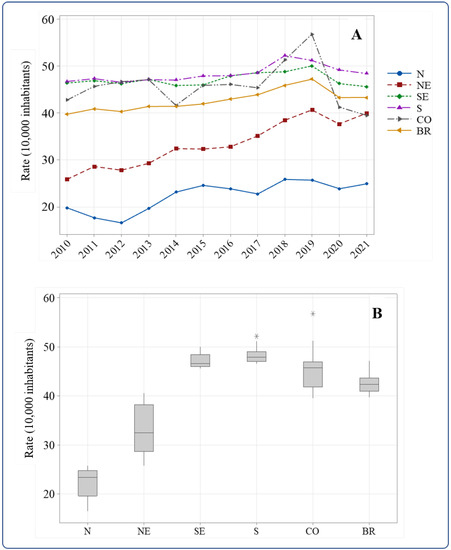 Temporal distribution (A) and box plot for median and quartiles (B) of the age-adjusted fall-related hospitalization rate in elderly people in Brazil and its regions, 2010 to 2021. * Outlier. Regions: N—North; NE—Northeast; SE—Southeast; S—South; CO—Center-West; BR—Brazil. Source: Brazil [13].