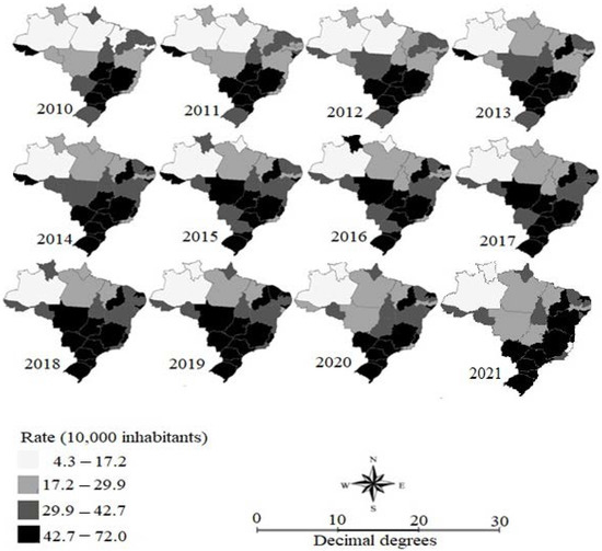 Thematic mapping of the smoothed fall-related hospitalization rate in elderly people per 10,000 people in Brazilian federative units, 2010 to 2021. Source: Brazil [13].