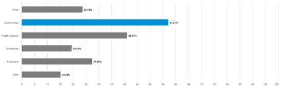 On the association of the term “age-friendly” with specific environments and age groups, the respondents reported more frequently hearing the term “age-friendly” with communities—nearly 60%—than any other option, including health systems (41%). These findings support our hypothesis that communities are most frequently associated with being “age-friendly” given the multiple domains of AFCs that create a multitude of opportunities for touchpoints with individuals. Only one in five respondents thought the term “age-friendly” was related to older adults. However, adults 65 and over more frequently answered that the term applied to seniors (33%), compared to only a small minority of those 40–49 (11%) answering the same. This runs contrary to our expectation that most respondents would relate “age-friendly” to older adults.