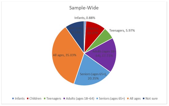 Sample-wide, only roughly 1 in 5 respondents (20.35%) indicated that the term age-friendly applies specifically to seniors (ages 65+) (Figure 2). Nearly the same percentage of respondents (17.71%) thought the term applied to individuals between the ages of 18–64. Most respondents (35.03%) said it applies to all ages. Nearly 10% were unsure.
