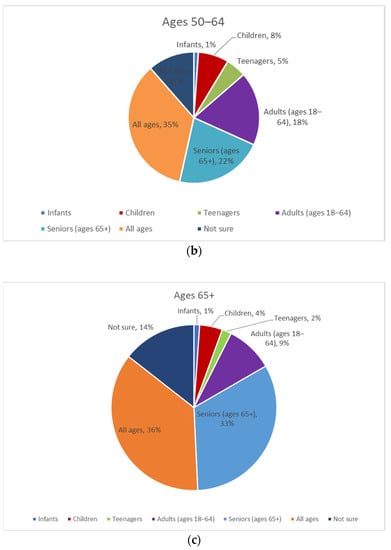 An analysis by age bracket (40–49, 50–64, and 65+) showed additional findings (Figure 3). Adults aged 65+ were most likely to answer that age-friendly applies to seniors (about 33%), followed by adults aged 50–64 (22%) and adults aged 40–49 (11%). Of the three age brackets, adults aged 40–49 more frequently answered that age-friendly applies to adults aged 18–64 (23%), teenagers (10%), and children (17%) than respondents over age 50.
