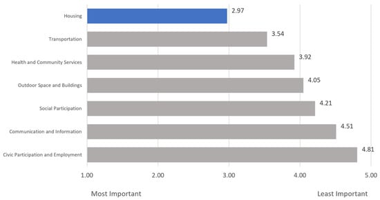 The participants were asked to rank seven choices related to age-friendly communities in order of importance, with 1 being the most important and 7 being the least important. Figure 4 shows that, on average, respondents found housing, with an average rank of 2.97, to be the most important aspect of an age-friendly community, followed by transportation (3.54) and health and community services (3.92). Communication and information and civic participation and employment were ranked lowest in priority on average.