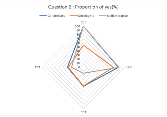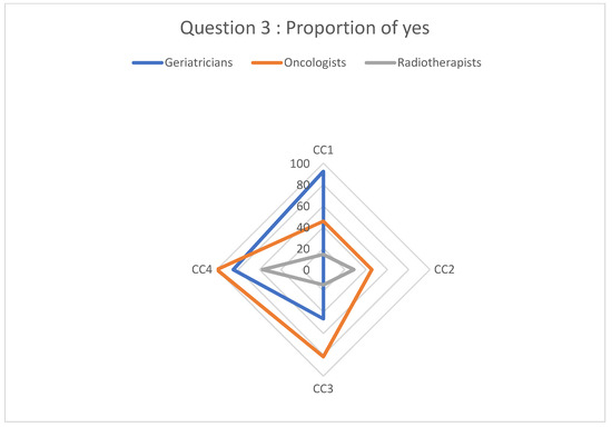 All characteristics of the respondents (oncologists, geriatricians, and radiotherapists) were described by percentages. This study has a purely exploratory descriptive objective and is based on 4 clinical cases. Hence, the statistical analysis is mainly descriptive. The respondents’ answers for each question were recorded by specialty, using numbers and percentages as well as graphs in order to evaluate the concordance between specialties. The number of clinical cases and raters did not allow for the calculation of Cohen’s Kappa coefficient to produce a concordance indicator.