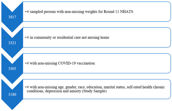 In this study, we used the NHATS data (n = 3817) from Round 11 which was collected from June to November of 2021 to provide measures for COVID-19 vaccination. We excluded nursing home residents from the analysis because they were not eligible for the NHATS sample person (SP) interview where most of our analytic variables were derived. We restricted our analysis to 3180 participants (1846 women and 1334 men) who had complete data for COVID-19 vaccination and covariates (see Figure 1 for exclusion criteria and sample size).