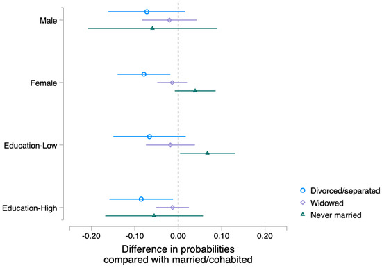 Difference in Probabilities of COVID-19 Vaccination Relative to Married or Cohabited Participants by Gender and Education.
