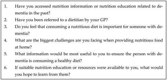 To our knowledge, no studies have attempted to assess carers’ nutrition knowledge in the Australian community or describe their preferred methods for acquiring nutrition knowledge and the potential support they need. For carers of people with dementia to provide optimal nutrition, it is important that they are equipped with appropriate knowledge about diet quality, maintaining energy intake, identifying nutritional risks, and strategies to promote the consumption of healthy foods, to maintain the overall well-being and health of the person they care for [,]. Therefore, the aim of this study was to provide insights into the nutrition knowledge of informal carers of people with dementia, common nutrition-related issues, and preferred delivery modes of nutrition education to potentially reduce the risk of nutritional deficiencies and nutrition-related issues, such as malnutrition in the person with dementia. The research questions are the following: