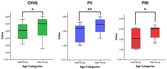 Figure 1 shows that the mean values of OHIS, PlI, and PBI were higher in the older group than the adult group. This study result proved that aging has impacts on periodontal status [23,24,40]. As people get older, they may experience changes in their oral health, which can be influenced by various factors, including age-related physiological changes, systemic health conditions, and lifestyle habits [24,40,41]. Older people become more susceptible to periodontal disease. This increased susceptibility is partly due to the cumulative effects of dysbiotic biofilms and oral bacteria over time [3,19,24]. Maintaining good oral hygiene becomes more challenging for some older people. The declining motor skills of older people can make brushing and flossing teeth difficult, leading to inadequate dysbiotic biofilms removal [3].