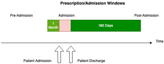 The DAD and PIN data were combined using the patient identifier and admission time windows, and any duplicate records in the provided source files were eliminated. The strategy utilised for joining these two datasets consisted of matching prescriptions for a given patient ID by date, identifying prescribed medications one month prior to admission and 180 days post-admission, and removing any prescriptions that fell into overlapping visit date windows as well as any duplication (Figure 1). The admission window is variable and not shown to scale.