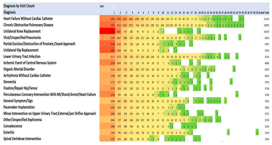 One method of visualising the large numbers of principal admitting diagnoses is to use “heat maps”, which show larger numbers of patients in hot colours (e.g., red) and smaller numbers in cooler colours (pale yellow and green). The principal admitting diagnoses are shown in Figure 2 and Figure 3 as heat maps, and the numerical data are also shown in the text below.