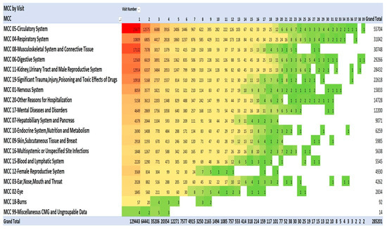 This pattern of serious illness was also seen in each of the admissions in each of the years 2013–2021. Figure 2 lists the top 20 of the 40 most frequent diagnoses. The Medical Council of Canada (MCC) diagnoses (Figure 3) with the darker red colour highlight the anatomic systems with the most numerous primary admissions and show the persistence of admissions with these organ system problems.