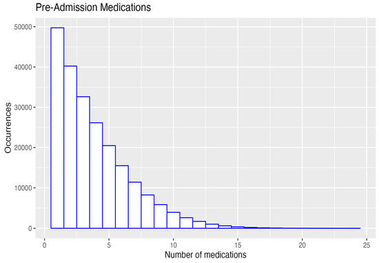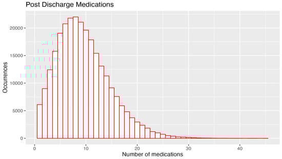 At their first admission, the 129,443 patients took a median of three medications, and on discharge, they took a median of nine medications. The maximum number of medications increased from 24 on admission to 45 on discharge (Table 1, Figure 4).