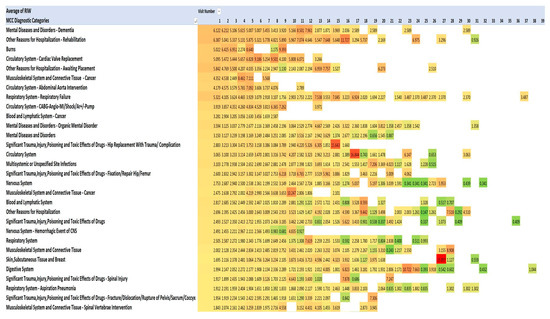 Costs of admissions measured using resource intensity weighting (RIW)—top 30. Red signifies highest value, green the lowest, yellow: 50th percentile.