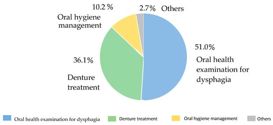 Regarding the reasons for referral to dentists from a medical doctor, 51.0% was for oral health examination, 36.1% was for denture treatment, and 10.2% was for oral hygiene management. (Figure 1).