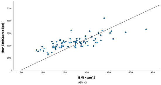 Illustration of the association between total calories (Kcal) and body mass index (BMI) (kg/m2).