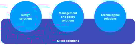 The majority of the papers analyzed in this study originate from Europe (n = 15) and China (n = 5), indicating the geographic distribution of research in this field. Notably, a diverse range of solutions encompassing policy-related, design-related, technological-related, and mixed approaches were identified. Figure 2 illustrates these four types of solutions. Among the different types of research conducted, reviews (n = 10), qualitative studies (n = 7), and applied studies (n = 7) were the most prominent categories, while data analysis studies or quantitative research (n = 4) represented a smaller portion. Data analysis studies primarily rely on open-access data and often utilize Geographic Information System (GIS) research methodologies, such as the visitation pattern analysis described in [52]. Qualitative studies employ questionnaires, observations, and interviews to gain insights into the specific challenges faced by park users in particular regions. For instance, Onose et al. focused on understanding the interactions, needs, and motivations of older individuals in Romanian public parks [107]. Literature reviews aim to establish parameters and guidelines for future research. As an example, Alves et al. defined parameters for constructing a walkability index map based on non-GIS information [108]. Lastly, applied studies concentrate on solutions, predominantly relying on wearables. An example is Lachtar et al.’s work, where they developed a cane utilizing LoRa and MQTT technologies for tracking older adults [109].
