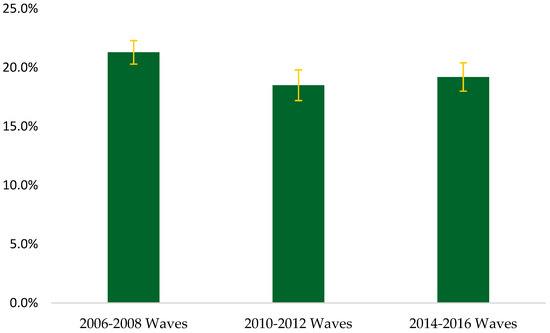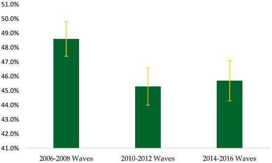 Table 1 shows the unweighted baseline descriptive characteristics of the 12,427 participants. Overall, persons were aged 72.7 ± 6.9 years and were mostly female (57.3%). Walking speed was 3.3 ± 1.7 s for young-old, 4.0 ± 2.7 s for middle-old, 5.0 s for old-old, 4.1 ± 3.3 s for Hispanic, 4.3 ± 2.5 s for non-Hispanic Black, 3.6 ± 2.6 s for non-Hispanic Other, 3.4 ± 1.8 s for non-Hispanic White, 3.8 ± 2.4 s for females, 3.3 ± 1.8 s for males. Figure 1 presents the overall prevalence of slow gait speed using a <0.8 m/s cut-point. The estimated prevalence of slow gait speed was 48.6% (CI: 47.4, 49.8), 45.3% (CI: 44.0, 46.6), and 45.7% (CI: 44.3, 47.1) in the 2006–2008, 2010–2012, and 2014–2016 waves, respectively. However, no significant trends in gait speed were observed over time (p = 0.06).