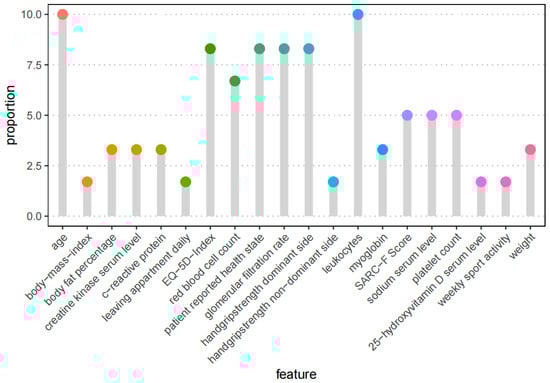 The evaluation of the feature frequency in our six different feature selection methods showed that age and leukocytes were the two most frequently selected variables for the regression analysis. They were selected by all six methods. By five methods, the variables EQ-5D index, GFR, grip strength of the dominant hand, and patient-reported health state were selected. The frequencies of all the selected features are shown in Figure 1 by proportion.