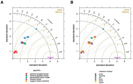To obtain an initial overview of the performance of the different models, we created a Taylor diagram [32] (Figure 2) in which the used algorithms are color-coded in A and the feature selection methods in B. This graphic, published first by Taylor in 2001 [32], aids in the comparison of several models. It measures the degree of agreement between modeled and observed behavior using three statistics: the Pearson correlation coefficient, the root mean square error (RMSE), and the standard deviation.