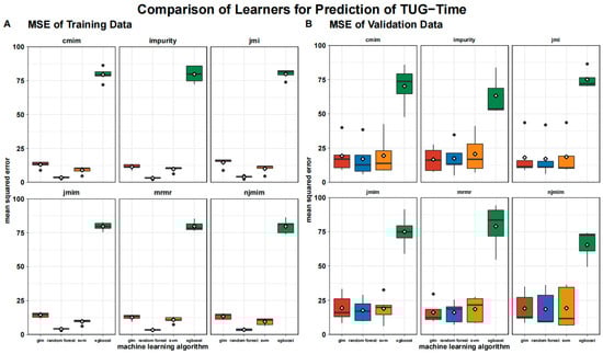 To comprehensively assess the outcomes achieved through the implementation of machine learning techniques, a test statistic was applied to the presented results. For comparison, the models were categorized based on their respective algorithm types, followed by an ANOVA-based pairwise comparison. The ANOVA analysis, with Tukey’s multiple pairwise comparisons of the mean squared error in TUG time estimation, revealed a significant inferiority of xgboost compared to the other three algorithms (p < 0.001). No statistically significant disparities were observed among the remaining three algorithms, namely the random forest algorithm, generalized linear model, and support vector machine.