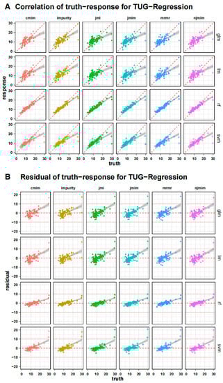 Figure 4 shows the individual results of the training process as a correlation plot to the actual values of the subjects after cross-validation, with only the test data in each case. Next to it is the corresponding residual plot, which revealed a significant increase in the actual time required. This pattern can be seen in all the algorithms used, whereby it is evident that these erroneous deviations are significantly greater with longer TUG test times with the generalized linear model and the support vector machine than with the random forest algorithm. Accordingly, the random forest algorithm overestimates the slow patients less when compared to all the other algorithms. The xgboost algorithm performed worst in the training and testing processes. With respect to the feature selection methods, only a few differences can be identified.