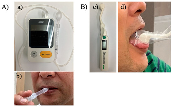 Measurement of tongue strength and oral mucosal moisture. (A) Tongue strength. (a) Tongue strength measurement device (b) Tongue strength measurement. (B) Oral mucosal moisture. (c) Oral moisture-checking device “Mucus” (d) Oral mucosal moisture measurement.